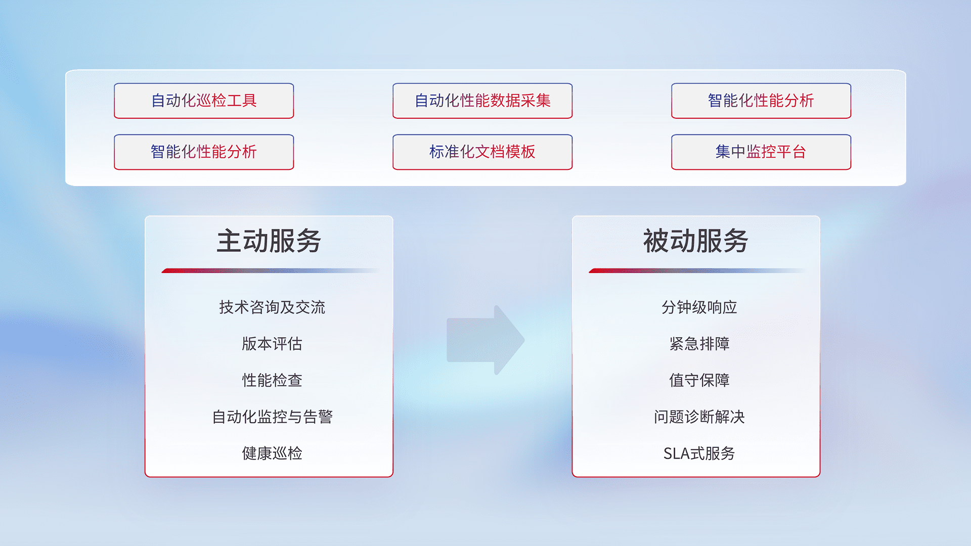 智能化工具和标准化文档,,保障服务质量,,,,提供主动服务(包含技术咨询、、、、版本评估、、性能检查、、自动化监控与告警、、、、健康巡检)和被动服务包含(分钟级响应、、、、紧急排障、、、值守保障、、问题诊断解决、、、SLA服务)。。。。